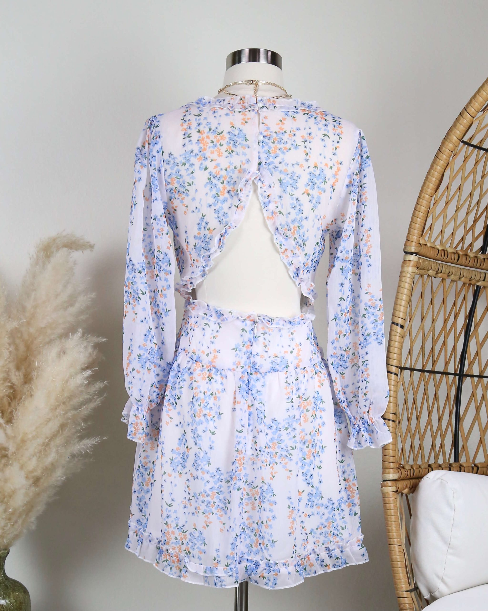 This gorgeous dress features a V-Neck, ruffle trimmings, and an open back.