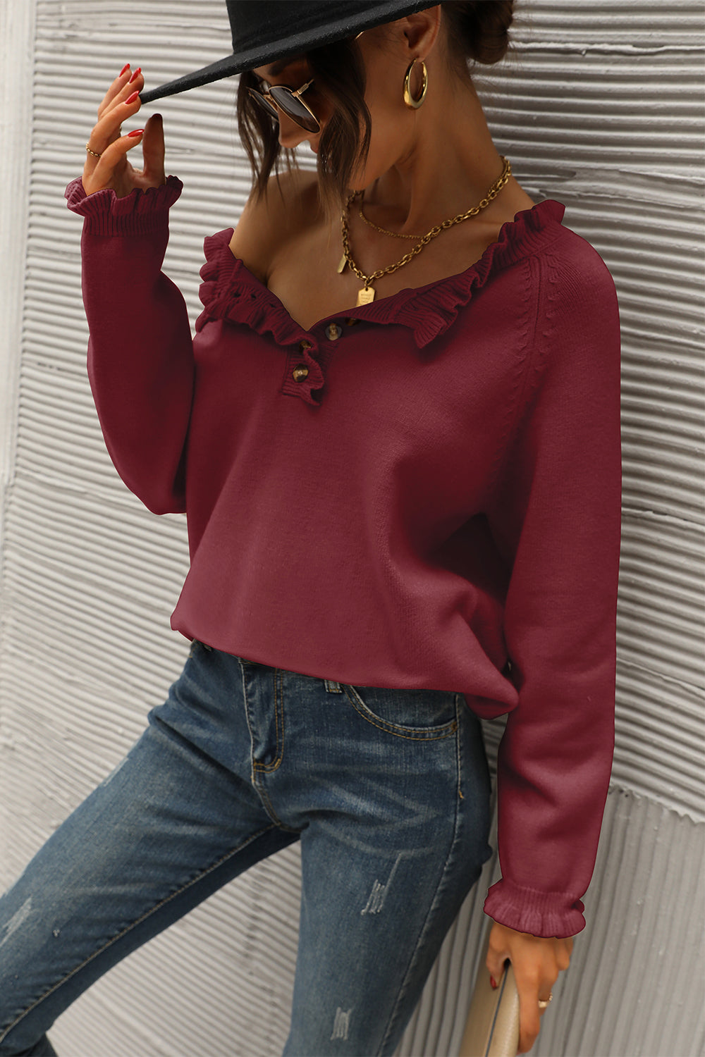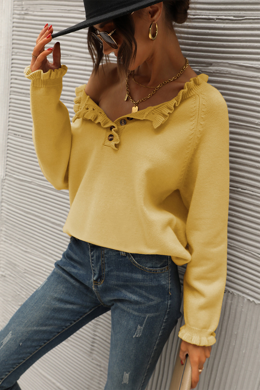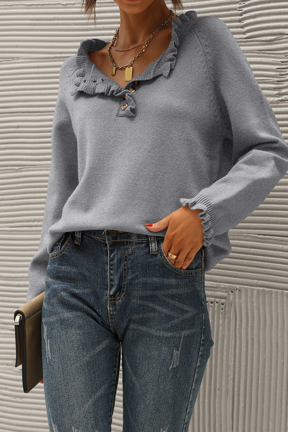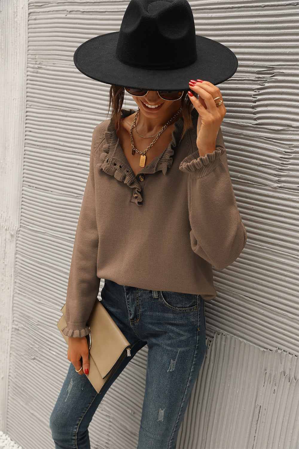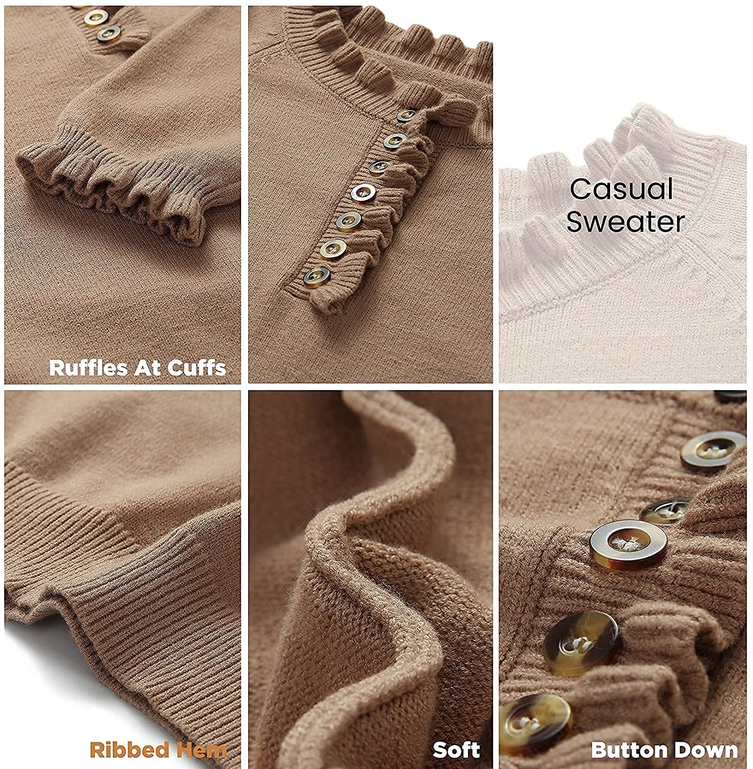 Long Sleeve Button Down Ruffle Knit Pullover Sweater Tops